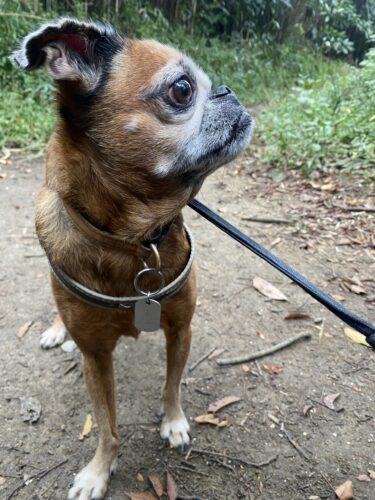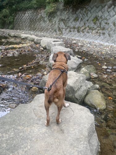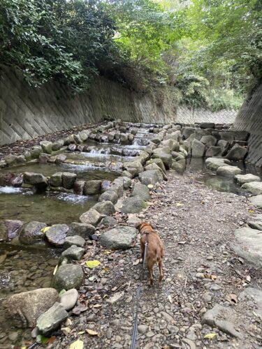 舗装路嫌いで車の音も嫌いなこへはバス通り歩いている時は、尻尾もべた下がりでビクビクで歩いていたけど、未舗装路になった途端に元気いっぱい。