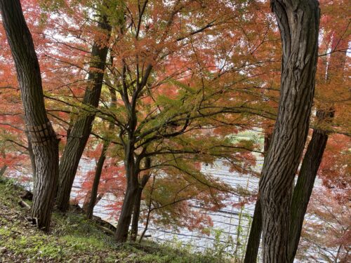 紅葉はちょうどいいんだけど、雲が多くてバックが青空じゃないのが残念。