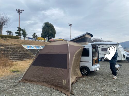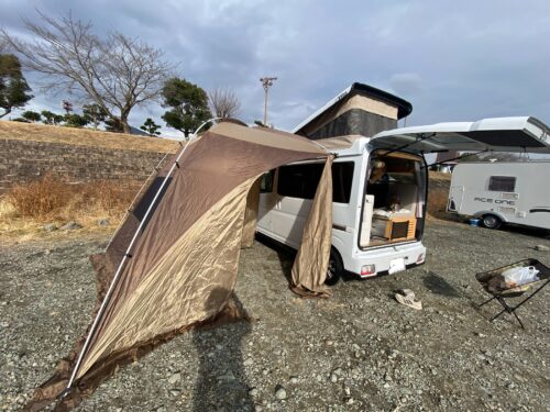 ペグダウン1本もしてないのでしわしわだけど、ハイエースのぴとん号の時より大きさフィットしてる。