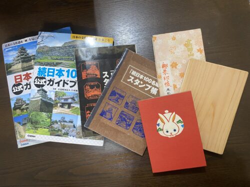 通常の御朱印帳でしょー、御城印帳でしょー、100名城スタンプと、続100名城スタンプでしょー・・・・・・