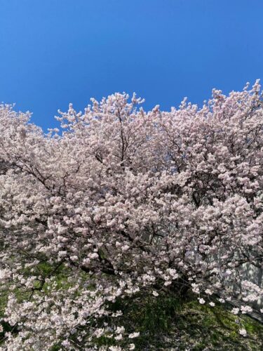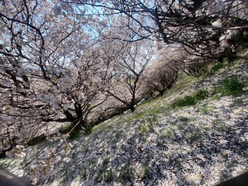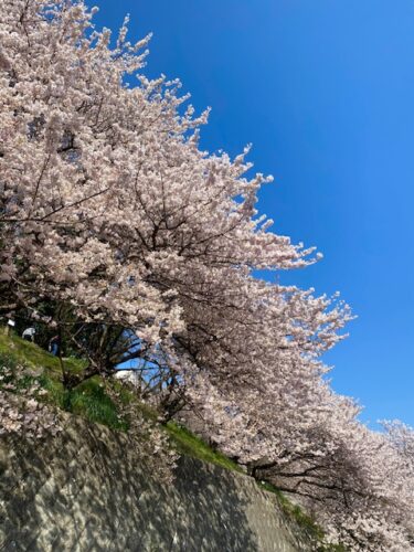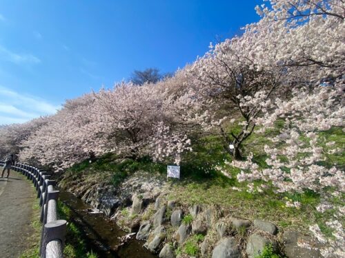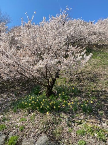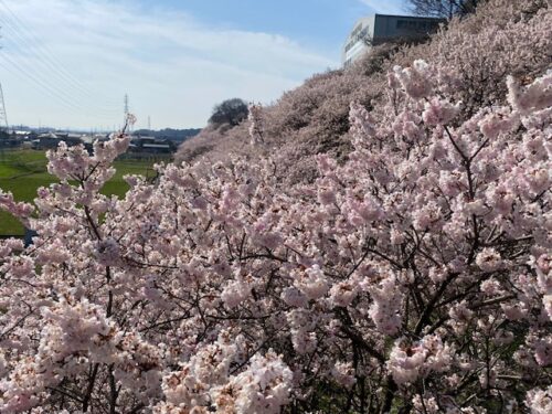 ここは怒田丘陵の斜面に春めきが植栽されていて、斜面下の遊歩道を桜を眺めながら歩くことができて、少し坂を登ると目の前に斜面の桜を見ることができるようになってます。