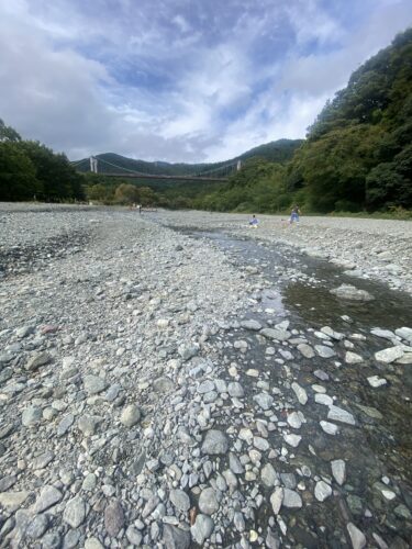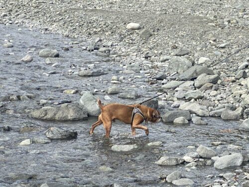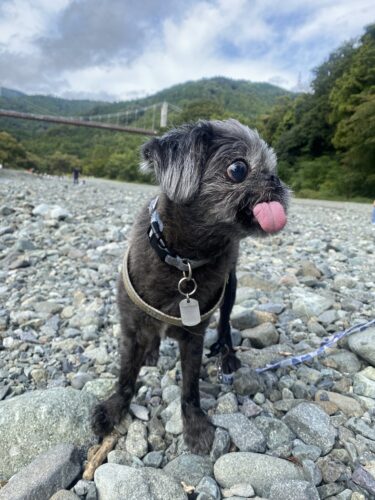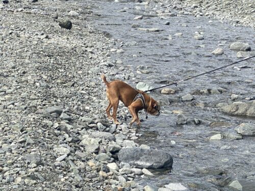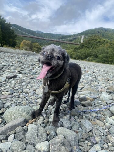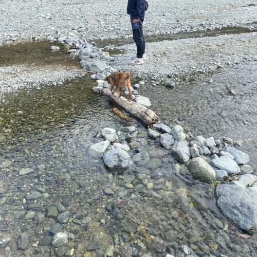 あさひ、ここまで頑張って歩いてきたけど、ゴロゴロの河原はやっぱりお籠。