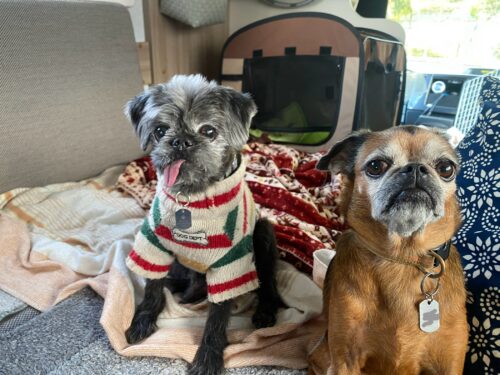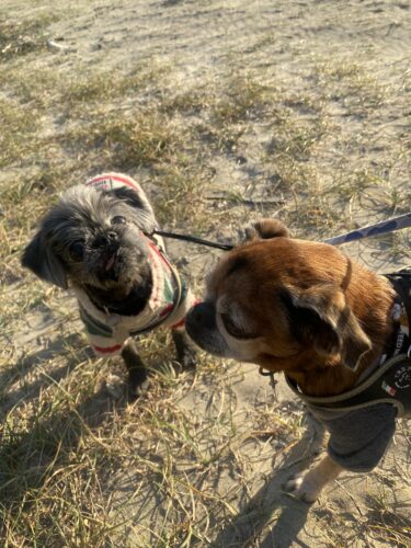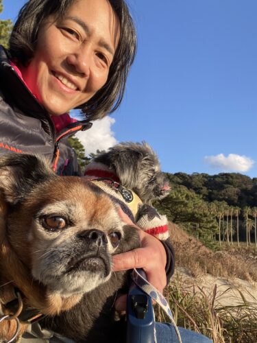 車内で本読んだりPCカチャカチャしてたら雲が切れ太陽があったかくなってきたので、二匹一緒に連れ出して、砂浜前の階段に座って日向ぼっこ。