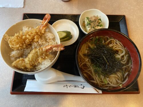 写真はランチセット。稲庭うどん(温)とエビ天丼。1045円。