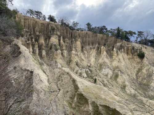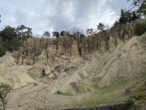 130万年前の扇状の地形が風雨の侵食と崩壊を繰り返して残ったもの。