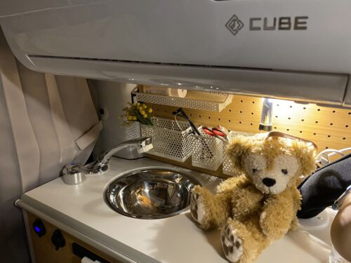 ヴィータ君に、エアコン仕様が付くとヴィータアウラ、と言うシリーズになるんだけど、もともと小さな棚がついてた部分にエアコンをセットしているので、水場の上の空間が非常に狭い。